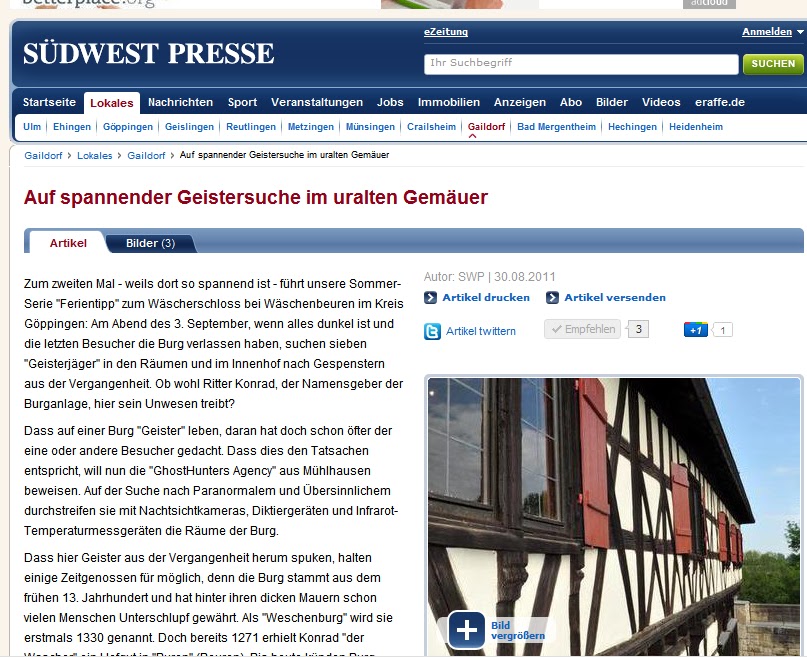 Zum zweiten Mal - weils dort so spannend ist - führt unsere Sommer-Serie "Ferientipp" zum Wäscherschloss bei Wäschenbeuren im Kreis Göppingen: Am Abend des 3. September, wenn alles dunkel ist und die letzten Besucher die Burg verlassen haben, suchen sieben "Geisterjäger" in den Räumen und im Innenhof nach Gespenstern aus der Vergangenheit. Ob wohl Ritter Konrad, der Namensgeber der Burganlage, hier sein Unwesen treibt?
